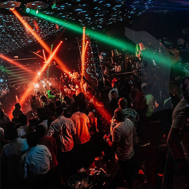 The Marq Nightclub experience begins the very moment guests pass through its dynamic walkway. The lobby boasts a cascading waterfall with a motion-sensor screen to mimic the visitors’ movements, thus exploring human interaction with a digital medium of art. With this dynamic visual representation of the guests, they step inside an enigmatic space that envelops them in wonder. A symphony of lights unfolds as five different types of LED installations illuminate the entire space. Among these LEDs, one is broken into several hexagons like an art installation, gracefully moving on hydraulics in sync with the music’s pulsating beat, while another forms a curtain of lights at the back of the VIP enclave. The columns are enveloped by captivating visuals brought to life through light projections, ensuring the incorporation of multimedia media in spatial elements of the structure as well. A continuous stretch of immersive visuals is materialised as the stage backdrop design via an LED media wall extending from the rear of the DJ booth to the ceiling. The spatial volume also showcases and advances the Digital Multiplex (DMX) lighting services, where the VIP section is adorned by a laser grid. Synchronised video content, lighting choreography, and soundscapes converge to form a harmonious palette of changing hues.
